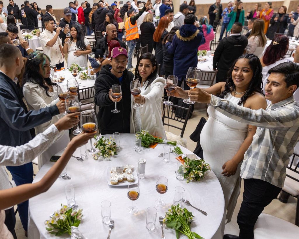 ● Los recién casados disfrutaron de la ceremonia totalmente gratuita con un brindis, banquete y rifa de electrodomésticos
