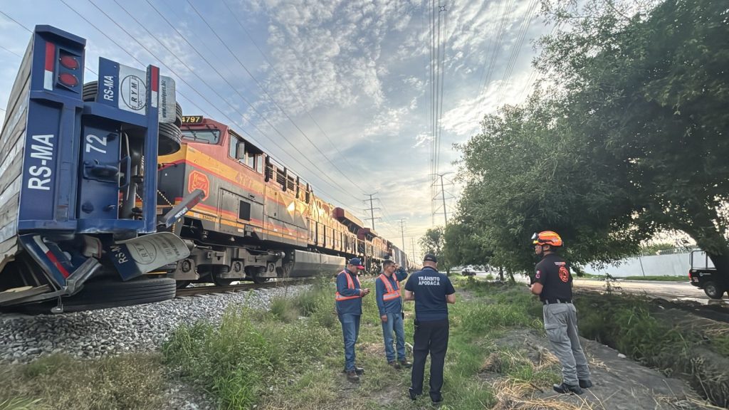 Según el reporte de Protección Civil de Nuevo León, un tren de Kansas City Southern (KCS), con máquinas 4797 y 4599, operado por Eduardo Campos, impactó un tráiler Kenworth con placas 75BE8B, cuyo conductor se dio a la fuga.