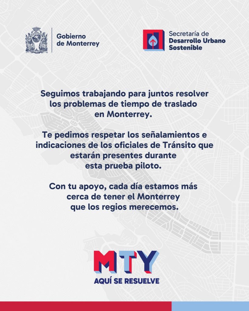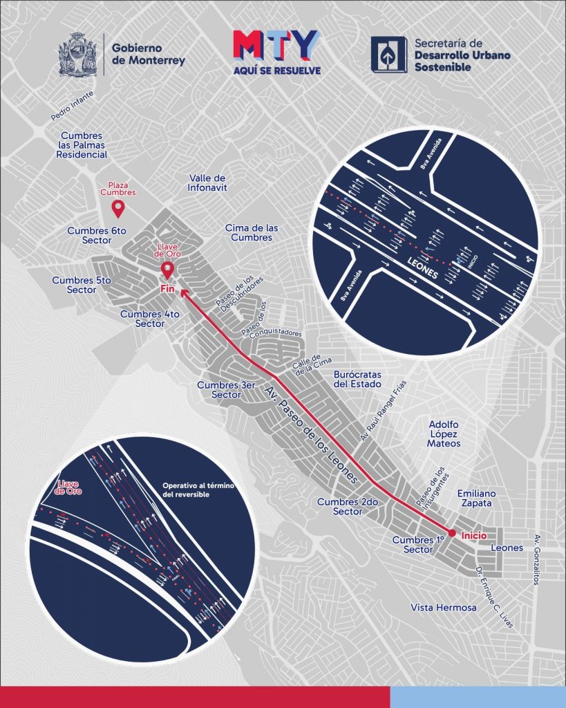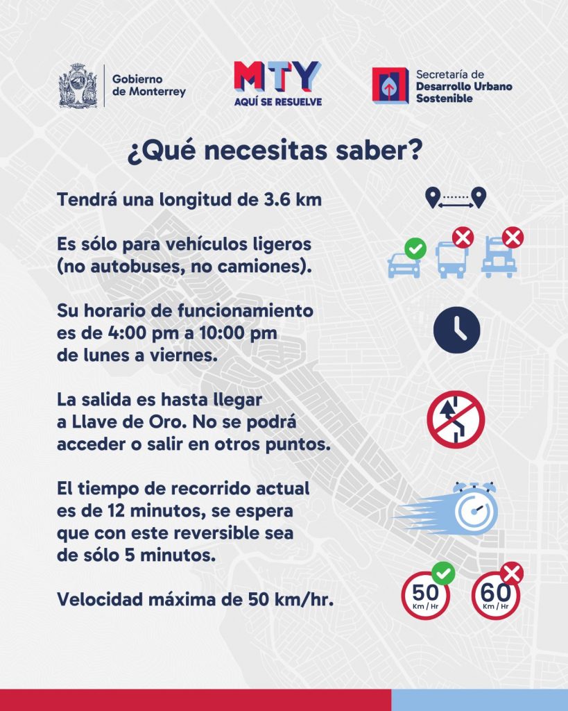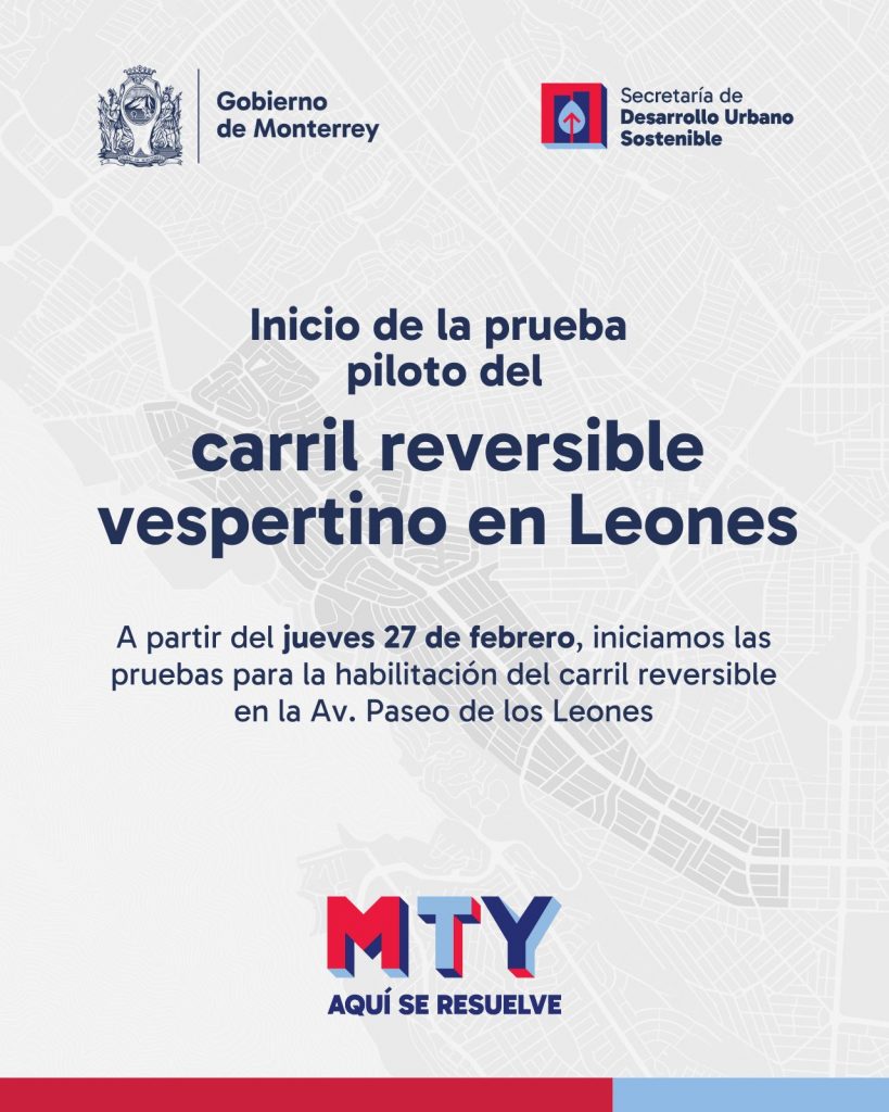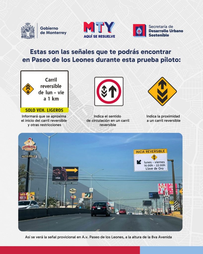 El próximo jueves 27 de febrero el Gobierno de Monterrey arranca la prueba piloto de un nuevo carril reversible vespertino sobre avenida Paseo de los Leones.