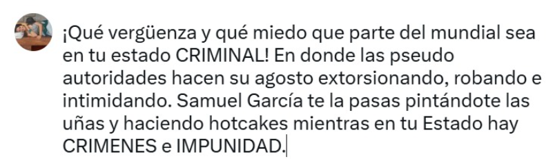 Lo que te espera en el Mundial, serás a burla de todo el mundo. Los regios vamos a despertar y no vamos a dejar que tu y mariana se salgan con la suya, nos han hecho mucho daño a Nuevo León y es tiempo de que paguen por todo el m