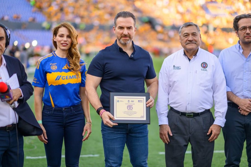 Previo al clásico regiomontano 140 del futbol profesional, este sábado el alcalde de Monterrey, Adrián de la Garza Santos, entregó un reconocimiento al rector de la Universidad Autónoma de Nuevo León, Santos Guzmán López por el aniversario número 65 del equipo “Tigres”.