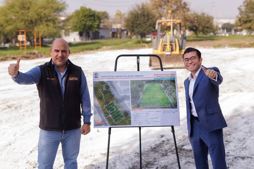 Juárez, Nuevo León, a 7 de enero del 2026.- Marcando un parteaguas en la historia del municipio, el alcalde Félix Arratia Cruz continúa con su misión de construir 100 nuevos Espacios de Unidad durante sus tres años al frente del municipio. En esta ocasión, el séptimo Espacio de Unidad de la segunda etapa del programa se construirá en la colonia Villas de Oriente, donde se instalará una cancha de pasto sintético de 800 metros cuadrados, una de las más grandes del municipio, que beneficiará a más de 2,500 vecinos y estará lista en apenas 90 días.