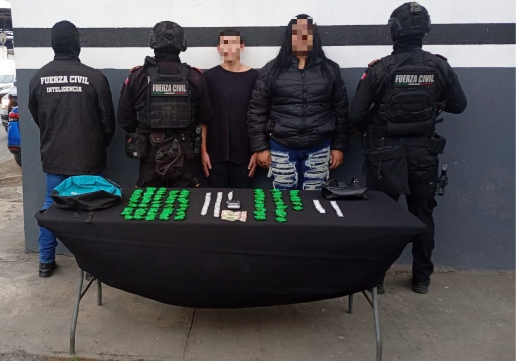 Los individuos se identificaron como José “N», de 32 años de edad, Nahomi “N», de 22; y dos adolescentes de 15 y 17 años de edad. En sus pertenencias encontraron: un arma corta abastecida con 10 cartuchos; 169 bolsas de plástico tipo ziploc con hierba verde y seca con características de la marihuana; 156 con una sustancia sólida cristalina similar a la droga conocida como cristal; 98 con una sustancia sólida en color blanco parecida a la cocaína en piedra y 17 con polvo blanco con la apariencia de la droga conocida como cocaína.