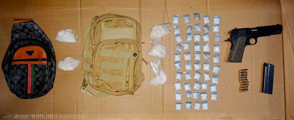 En la inspección precautoria realizada a los presuntos infractores, se encontró y decomisó: un arma de fuego corta abastecida y 54 envoltorios con una sustancia sólida granulada similar al cristal.