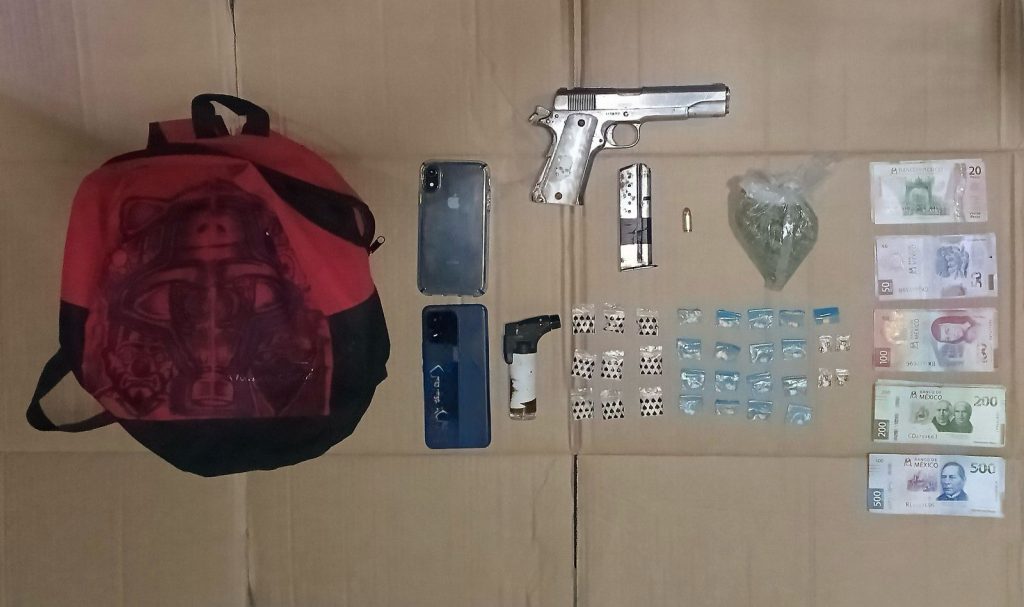 El masculino se identificó como Julio “N”, de 34 años de edad, y se le solicitó autorización para realizar una revisión precautoria a sus pertenencias en las que encontraron un arma corta abastecida, un envoltorio con hierba verde y seca con las características de la marihuana, 30 con lo que parecía ser cristal y siete mil 570 pesos en efectivo.