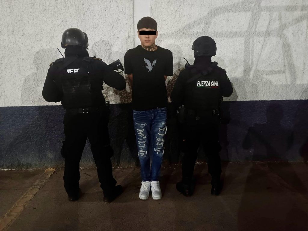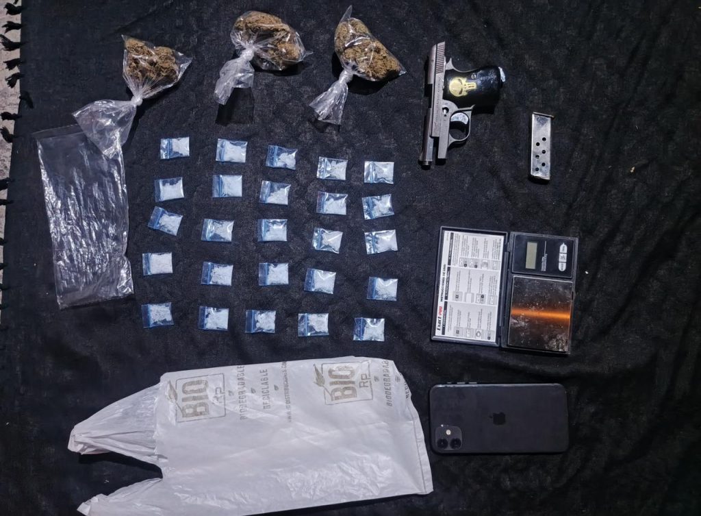 El probable infractor fue identificado como Brayan “N”, de 21 años de edad y se le solicitó autorización para realizar una revisión precautoria a sus pertenencias en las que encontraron: un arma corta desabastecida, tres envoltorios con hierba verde y seca con las características de la marihuana; 25 dosis con una sustancia parecida al cristal, una báscula digital y un celular.