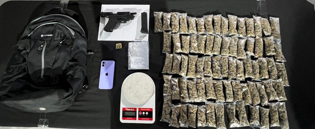 Los oficiales lograron interceptar a Irvin “N”, de 18 años de edad y le solicitaron autorización para realizar una revisión precautoria a sus pertenencias, en las que encontraron: un arma corta abastecida, 71 dosis de hierba verde y seca con las características de la marihuana, una báscula digital y un celular.