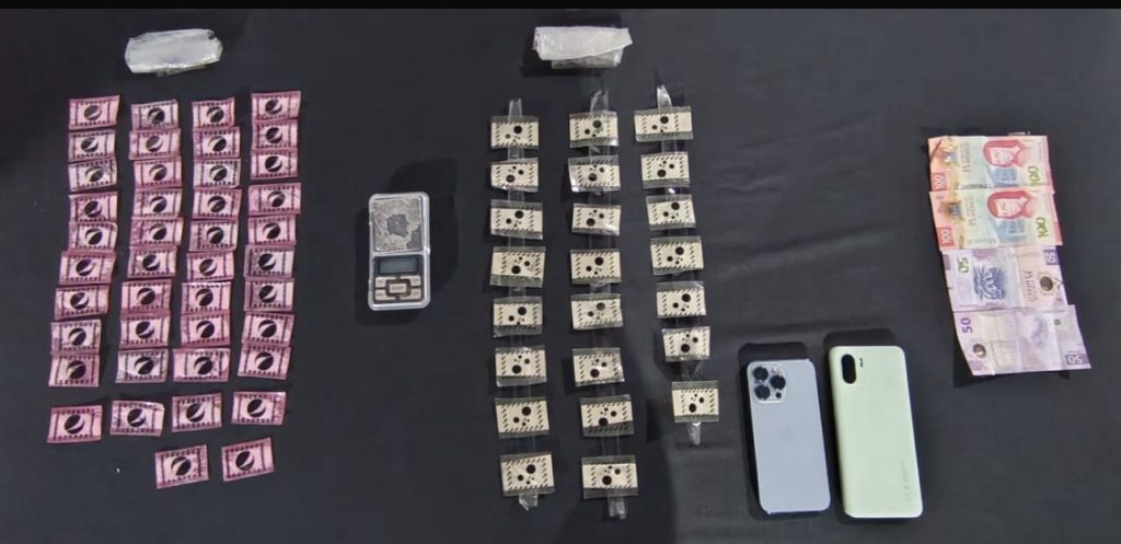 El varón se identificó como Jorge “N”, de 43 años de edad y se le solicitó autorización para realizar una revisión precautoria a sus pertenencias, en las que encontraron: 42 dosis de una sustancia sólida parecida al cristal, 23 de un polvo blanco similar a la cocaína, una báscula digital y dos celulares.