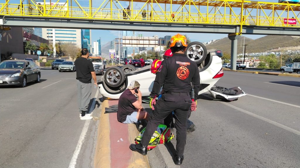 Con las cuatro llantas para arriba terminó la vida útil de un vehículo que previamente colisionó contra otras tres unidades en el cruce de Paseo del Rosario y Paseo Nora, en la colonia Valle del Mirador.