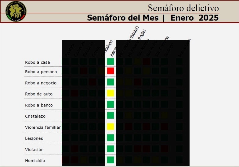 Estos indicadores corresponden a la última medición de la Fiscalía General de Justicia de Nuevo León que emite reportes mensuales con base en estadísticas oficiales del semáforo delictivo, mostrando un disminución significativa en los índices delictivos antes mencionados.