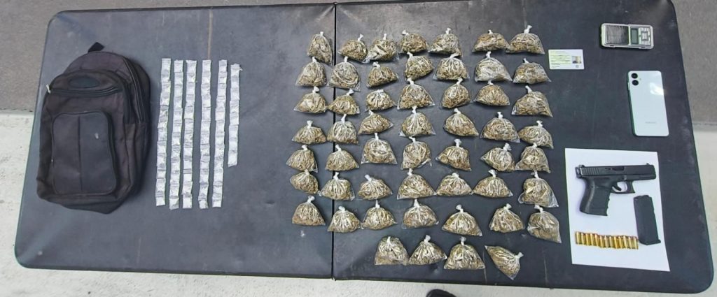 El masculino fue identificado como Rafael “N”, de 38 años de edad y le solicitaron autorización para efectuar una revisión precautoria a sus pertenencias, en las que encontraron un arma corta abastecida con 13 balas, 53 envoltorios con hierba verde y seca con las características de la marihuana, 68 dosis de una sustancia sólida parecida al cristal, una báscula digital y un celular.