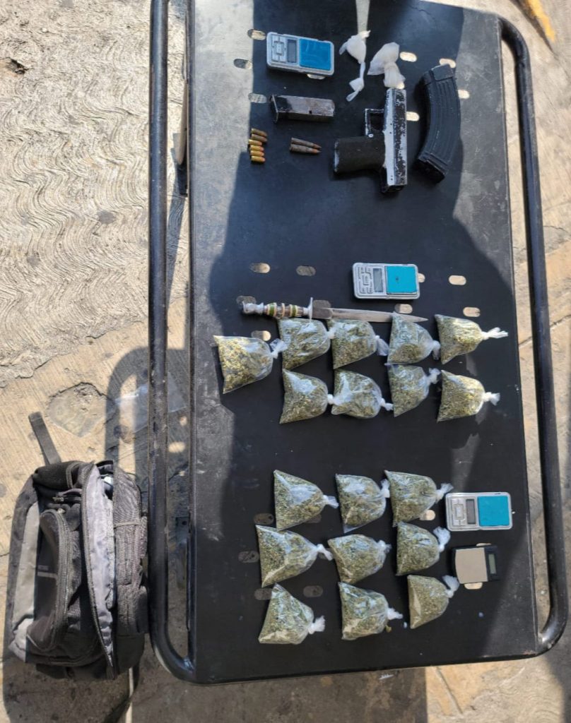 Tras la identificación, se estableció que Julio César cuenta con una orden de aprehensión vigente por narcomenudeo.Los efectivos les aseguraron durante la revisión 18 bolsas con hierba verde similar a la marihuana, tres dosis de una sustancia similar al cristal, un arma corta con un cargador con seis cartuchos, un cargador de arma larga con dos cartuchos hábiles, además de cuatro básculas grameras.El despliegue de los elementos municipales de Guadalupe, de Fuerza Civil y del Ejército Nacional se originó después de que agentes del área de inteligencia investigaron la presencia de los presuntos narcomenudistas en el exterior de una vivienda ubicada en la calle Italia, en la Colonia Villa Olímpica.