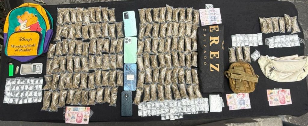 Los sospechosos se identificaron como Miguel “N”, de 22 años de edad, Omar”N”, de 29; Leonardo de 26 y Carlos “N”, de 27. También les solicitaron autorización para realizar una revisión precautoria a sus pertenencias, en las que encontraron: 99 dosis de una sustancia similar al cristal,125 envoltorios con hierba verde y seca con las características de la marihuana; cuatro celulares y una báscula digital.