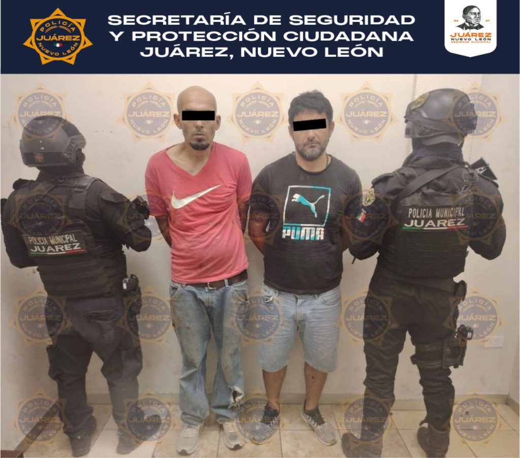 JUÁREZ, N.L.- Durante recorridos de prevención y vigilancia dentro del operativo Calles en Orden, policías de la Secretaría de Seguridad y Protección Ciudadana de Juárez realizaron la detención de dos hombres en posesión de droga en la colonia Hacienda El Campanario.