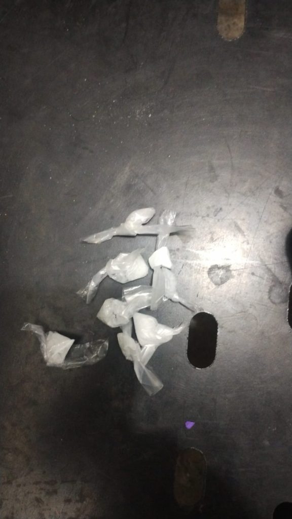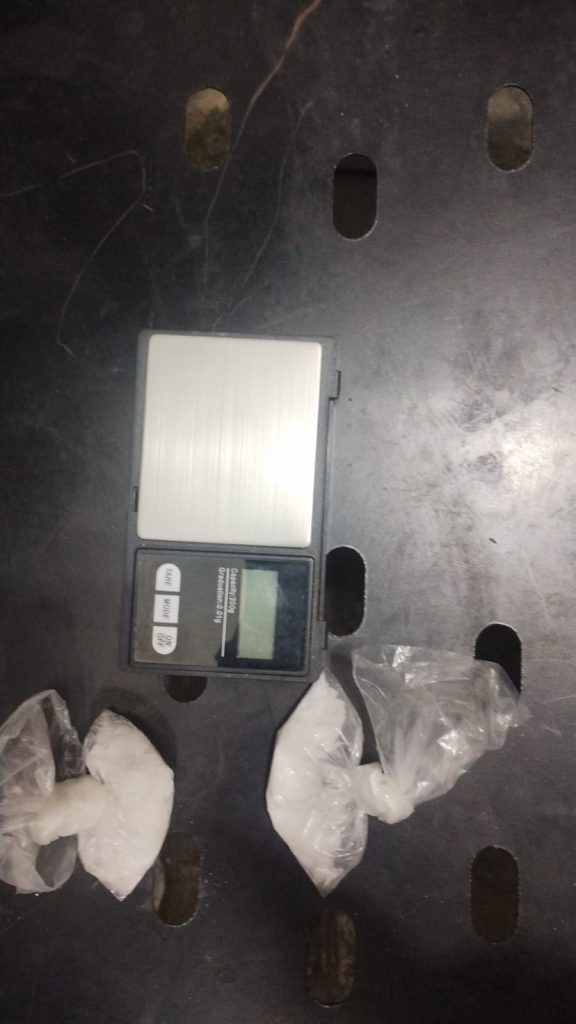 Los agentes policiacos les hallaron a padre e hijo nueve envoltorios de una sustancia similar a la droga conocida como cristal, además de una báscula gramera.