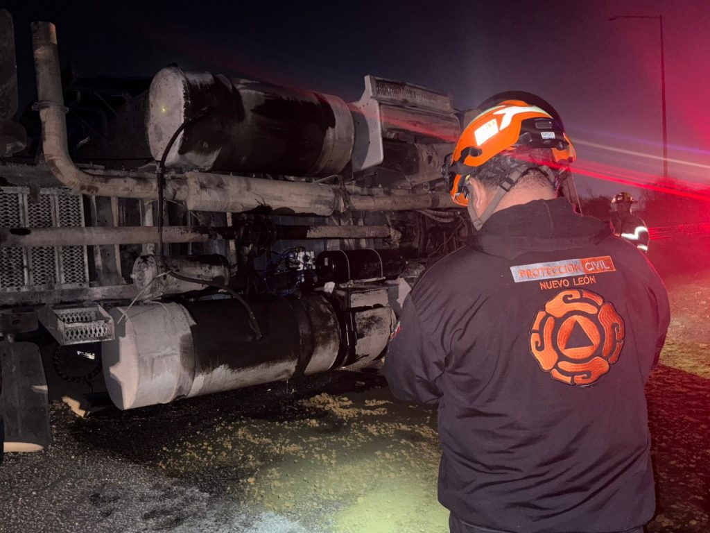 De acuerdo con el reporte preliminar de la Unidad de Protección Civil de Nuevo León, al arribo al lugar se confirmó que el tractocamión se encontraba volcado del lado izquierdo sobre una glorieta de la vía, con daños estructurales importantes en el tanque principal que presentaba dos perforaciones, lo que ocasionó un derrame considerable de diésel sobre la superficie de la carretera.