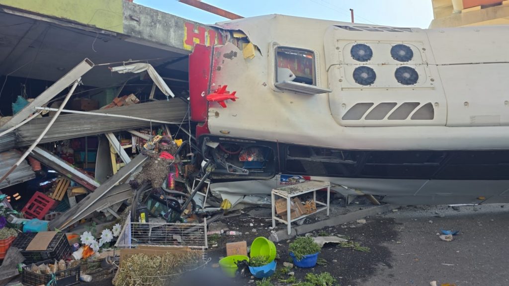 Un aparatoso accidente vial sacudió la tarde de este domingo la zona comercial de la colonia Moderna, cuando un camión urbano de la ruta 405 perdió el control y se estrelló contra locales del mercado “Francisco Villa”, causando daños materiales significativos y dejando dos personas lesionadas.