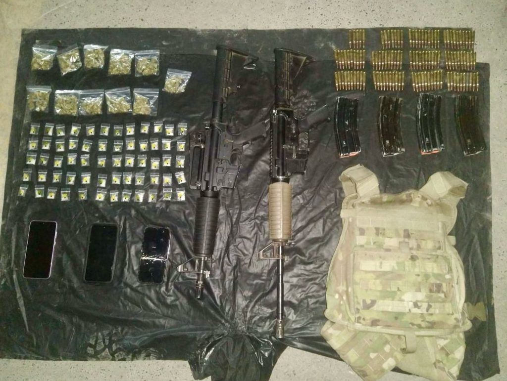 Los agentes estatales lograron interceptar a los ocupantes del coche, que se identificaron como Alexis “N”, de 33 años de edad; María “N”, de 41; Ashly “N”, de 23 y Oscar “N”, de 35. Además se les solicitó autorización para realizar una revisión precautoria a sus pertenencias en las que encontraron: dos armas largas abastecidas con un total de 52 balas, un chaleco balístico, dos cargadores abastecidos con un total de 60 municiones; 11 envoltorios con hierba verde y seca con las características de la marihuana; dos cargadores abastecidos con un total de 60 municiones y tres celulares.