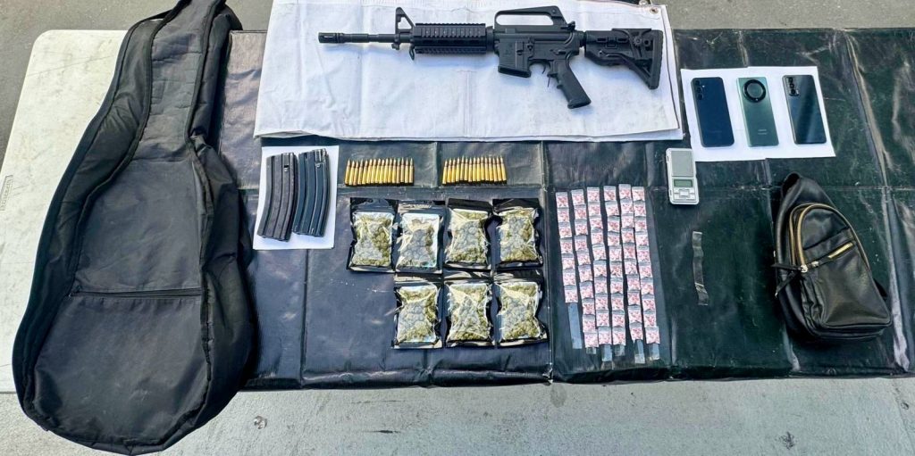Los ocupantes de la camioneta se identificaron como: Esaú “N”, de 32 años de edad y Rosa “N”, de 31 a quienes se les solicitó autorización para realizar una revisión precautoria a sus pertenencias en las que encontraron: un arma larga abastecida con dos cargadores y 31 balas, tres celulares, siete dosis de hierba verde y seca con las características de la marihuana, una báscula digital y un estuche de guitarra.