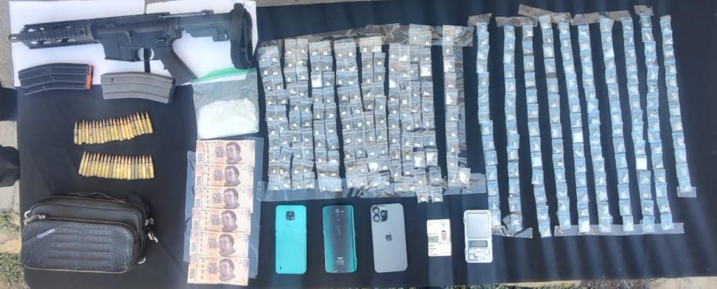 El resultado de la inspección fue el decomiso de: un arma larga abastecida con 20 balas, un cargador con 21 municiones, una bolsa con una sustancia sólida parecida al cristal, 145 dosis con este mismo estupefaciente; 162 envoltorios con lo que parecía ser cocaína en piedra, una báscula digital, una identificación y tres mil pesos en efectivo.