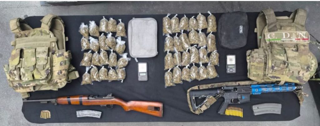 Dos armas largas abastecidas con un total de 21 municiones, dos chalecos balísticos, dos chalecos balísticos, dos básculas digitales y 44 envoltorios con hierba verde y seca con las características de la marihuana.