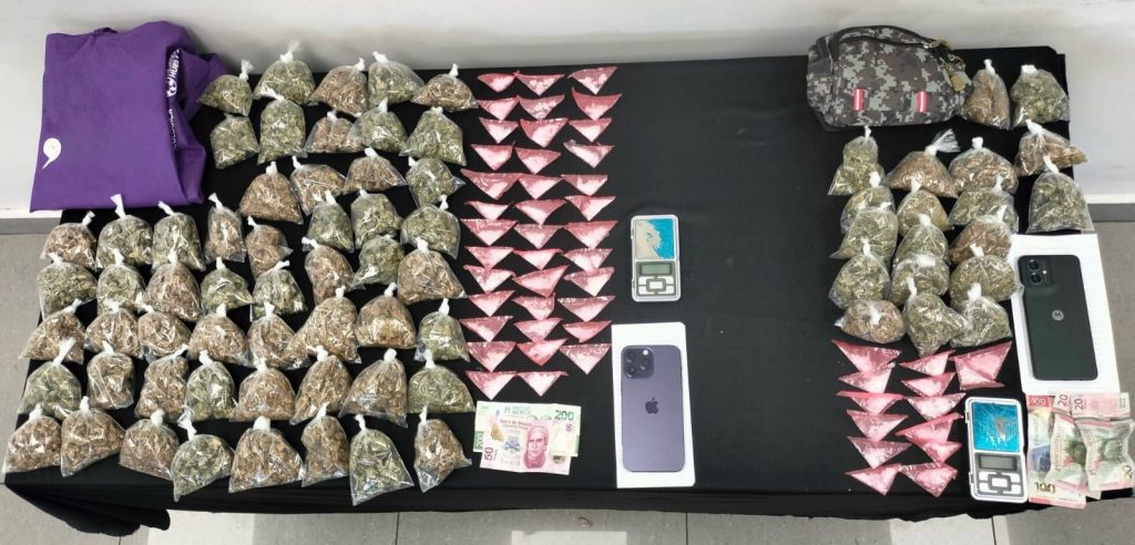 Por estar alterando el orden del lugar y la resistencia a particulares, los uniformados les solicitaron una revisión precautoria en la que encontraron: 73 envoltorios de hierba verde y seca con las características de la droga conocida como marihuana; 52 dosis que contienen sustancia sólida cristalina con las características de la droga conocida como cristal; dos básculas, dos celulares y dinero en efectivo.