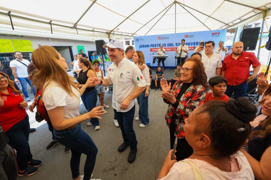 En un ambiente de convivencia vecinal, el alcalde de Monterrey, Adrián de la Garza encabezó la celebración por el 53 aniversario de la colonia Tierra y Libertad, Sector Sur, en compañía de su esposa, Gaby Oyervides, acercando servicios y atención directa a los vecinos.