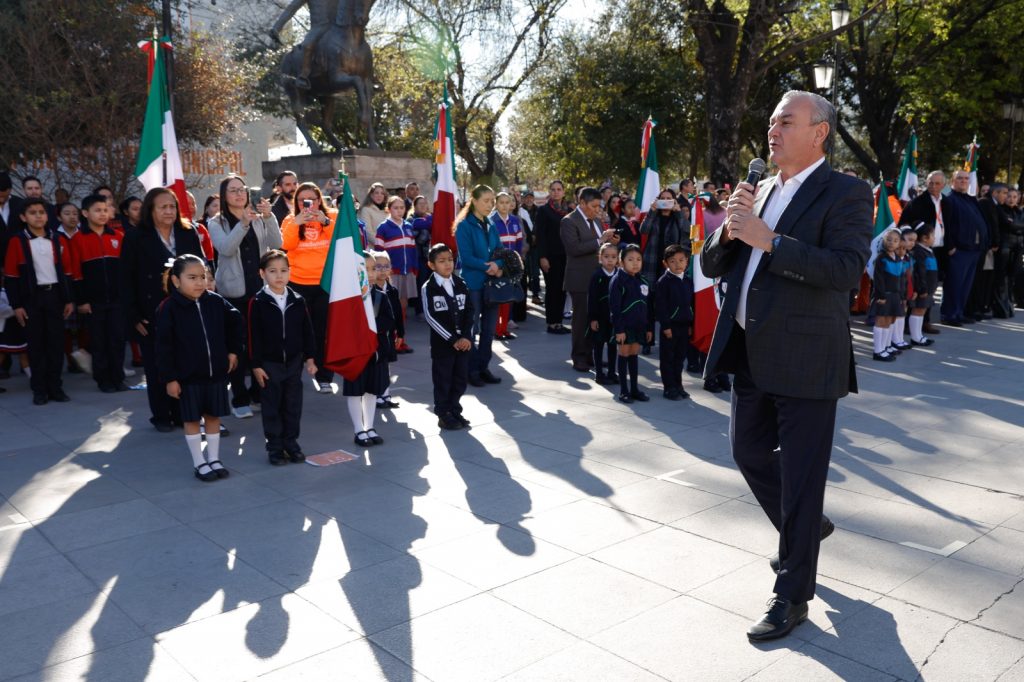 Escoltas de 101 planteles educativos del nivel básico celebraron el Día de la Bandera en el Centro Histórico de Guadalupe.