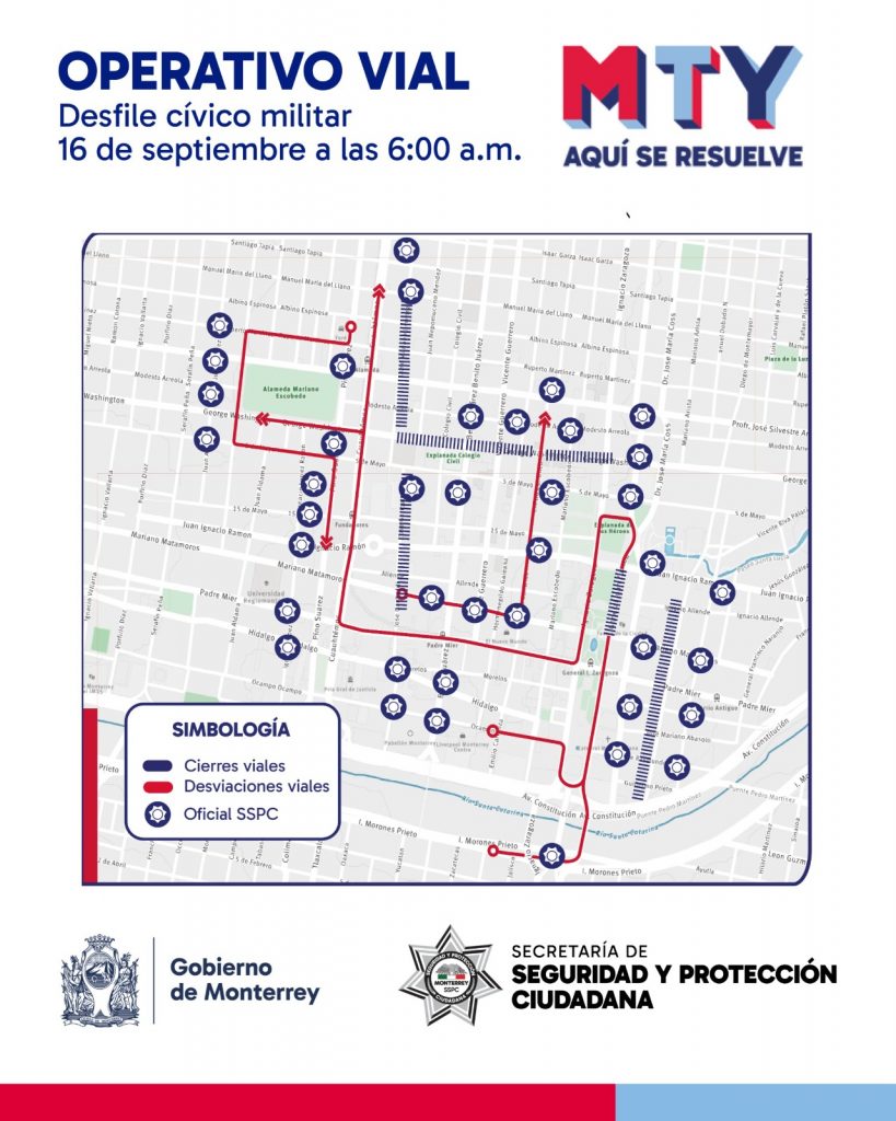 Con motivo del desfile cívico militar para conmemorar el Día de la Independencia, la Secretaría de Seguridad y Protección Ciudadana de Monterrey implementará este martes cierres viales en calles del primer cuadro de la ciudad.