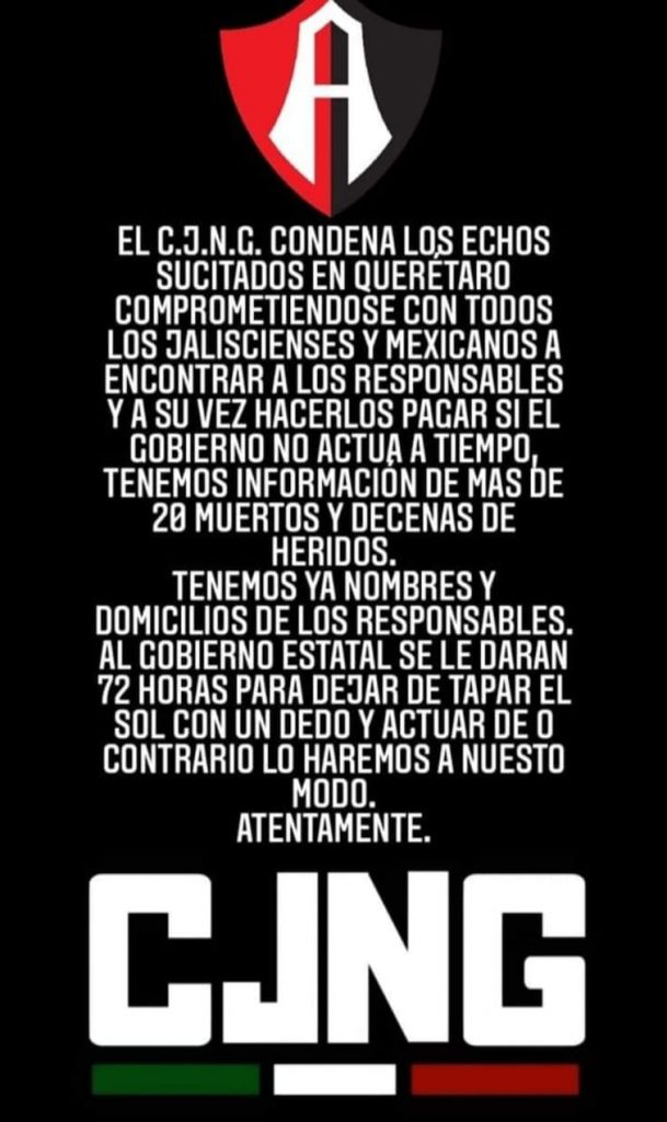 A la mesa de información, nos llegó este comunicado en el cual un grupo delictivo advierte sobre posibles represalias en contra de las autoridades del Estado de Querétaro si no actúan y hacen justicia encontra de los autores de los hechos violentos ocurridos el pasado sábado en el estadio Corregidora