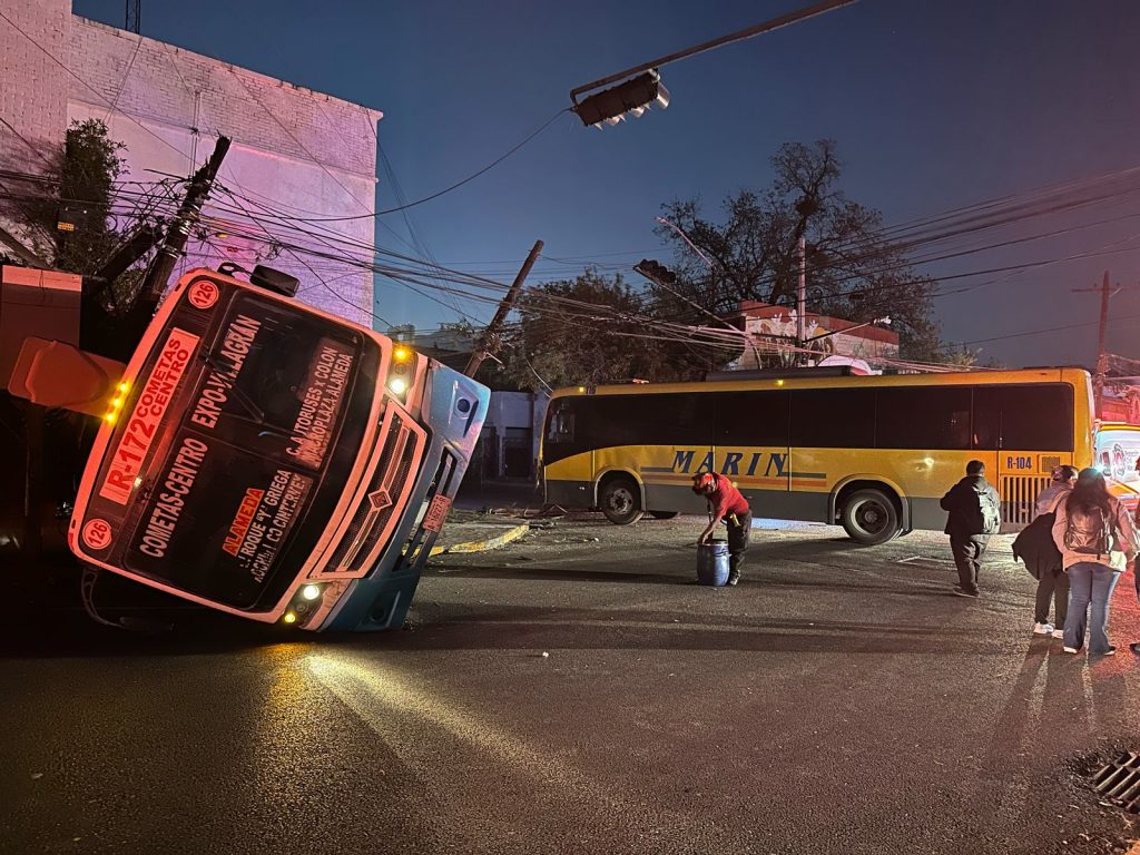 Los hechos ocurrieron en el cruce de las calles Platón Sánchez y Arteaga en el Centro de Monterrey, en donde uno de los conductores circulaba en aparente exceso de velocidad y al respetar la luz roja del semáforo, chocó con otro autobús, mismo que volcó y se estrelló contra una propiedad privada; además dos postes de luz cayeron tras el impacto del autobús.