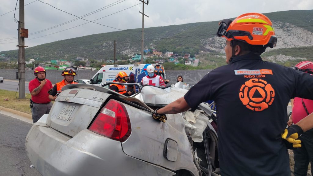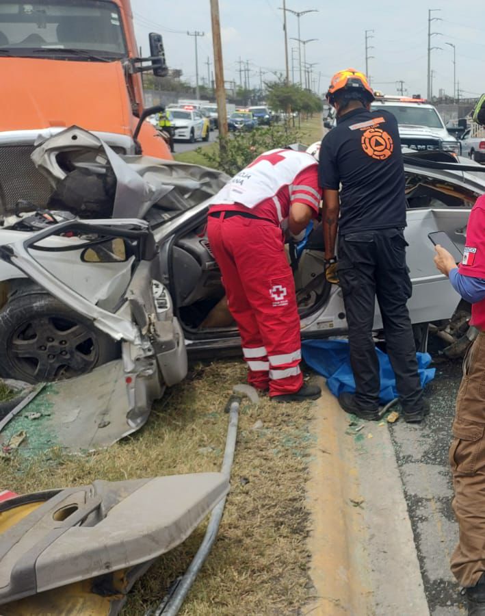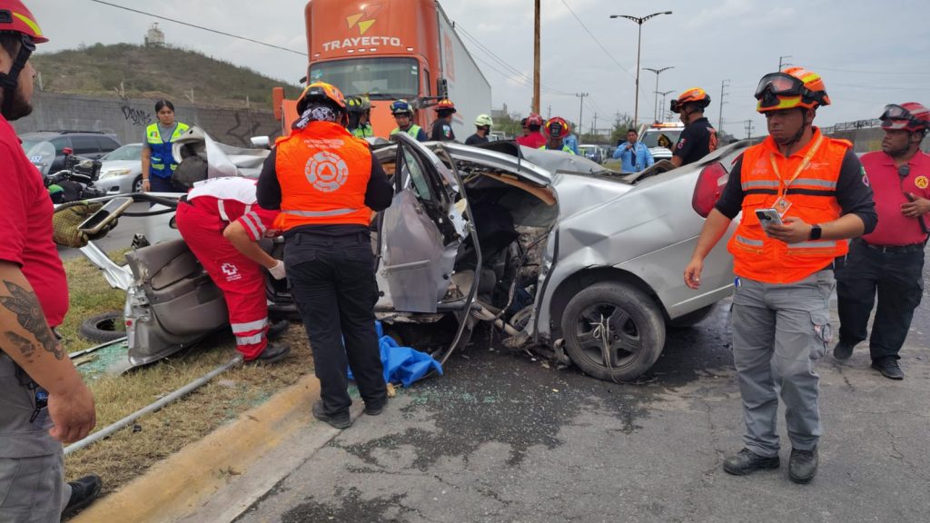 .De acuerdo con Protección Civil Nuevo León, el vehículo Malibú, tripulado por un hombre y una mujer, se salió de su carril e invadió el sentido contrario, colisionando contra un tráiler Kenworth con número económico ALA 2302, que transportaba 18 toneladas de envases de vidrio en una caja seca.