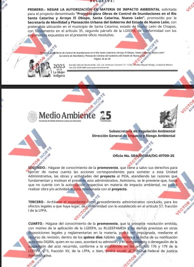 La SEMARNAT negó la autorización del Manifiesto de Impacto Ambiental (MIA) presentado por la Secretaría de Movilidad y Planeación Urbana del Gobierno del Estado para el proyecto “Obras de Control de Inundaciones en el Río Santa Catarina y Arroyo El Obispo, Santa Catarina, Nuevo León”. El proyecto contemplaba la construcción de dos presas rompe picos y el mantenimiento de la Presa Corral de Palmas, con el objetivo de controlar avenidas y reducir el riesgo de inundaciones en la región. Sin embargo, la autoridad federal determinó que la propuesta incumplía con las normativas ambientales y ponía en riesgo la integridad del ecosistema.