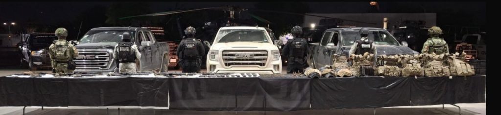 Como resultado de los trabajos en conjunto de elementos de la Defensa, Guardia Nacional y Fuerza Civil; este martes se efectuó el aseguramiento de equipo táctico y armamento de un grupo criminal con presencia internacional.