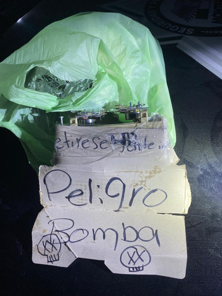 Al revisarlo detectaron que portaba una bolsa que simulaba ser un artefacto explosivo, y una hoja de papel que decía “RETIRESE GENTE, PELIGRO BOMBA”.