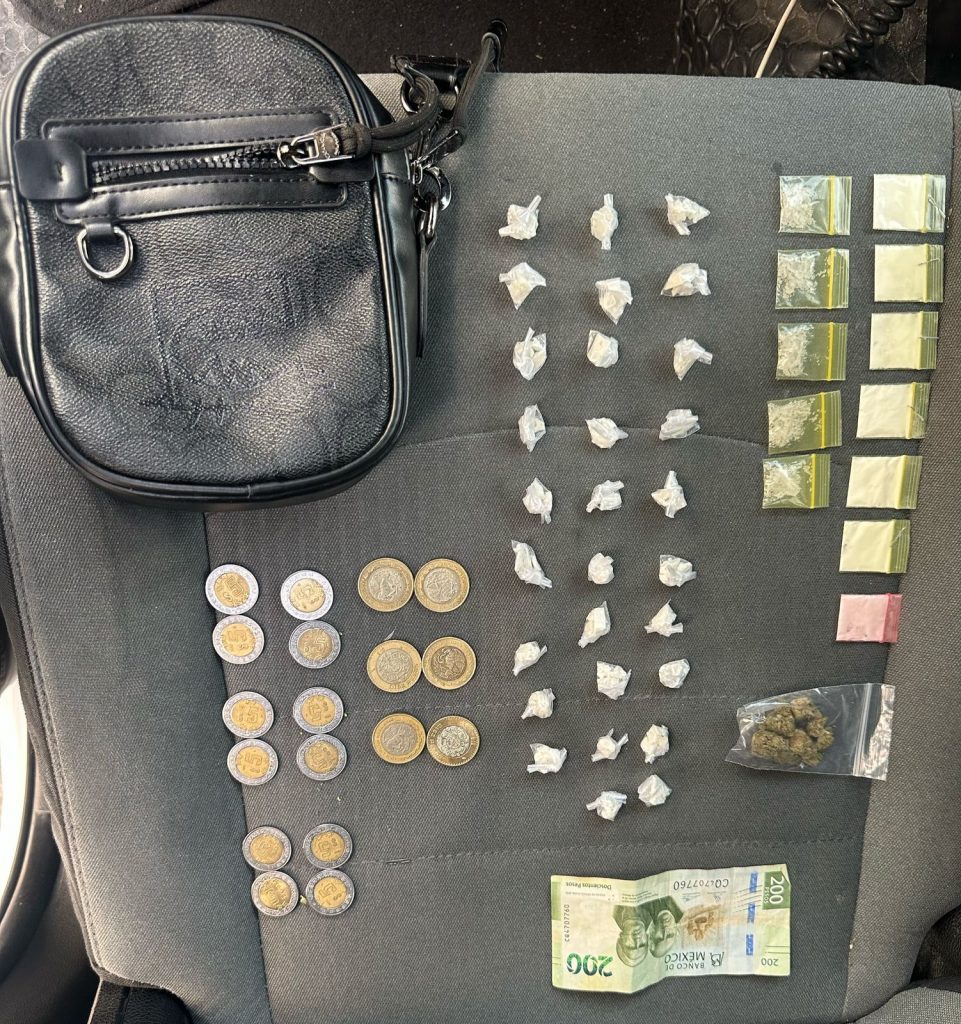 Sin embargo, al revisarlo le localizaron en una bolsa “mariconera” siete bolsas con polvo blanco similar a la cocaína, 34 envoltorios con una sustancia igual a la droga tipo cristal y una con hierba verde con las características de la mariguana, así como 320 pesos en efectivo, por lo que procedieron a detenerlo.