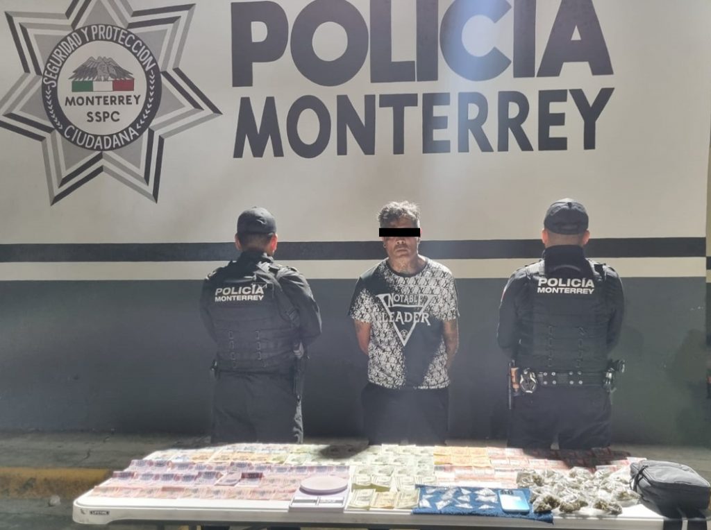 Un hombre fue detenido por oficiales de la Policía de Monterrey, por presuntamente tener en su poder 19 bolsas con hierba verde similar a la mariguana, 14 con una sustancia sólida parecida a la cocaína en piedra, 35 dólares y cerca de 15 mil pesos en efectivo.