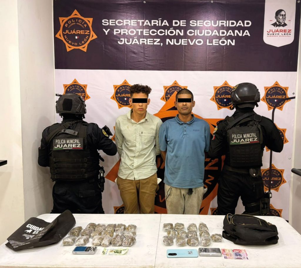 JUÁREZ, N.L.- En el marco del operativo Calles en Orden, elementos de la Secretaría de Seguridad y Protección Ciudadana de Juárez detuvieron a dos hombres por delitos contra la salud, tras ser sorprendidos en una riña en la vía pública en la colonia Fraccionamiento Arcadia.