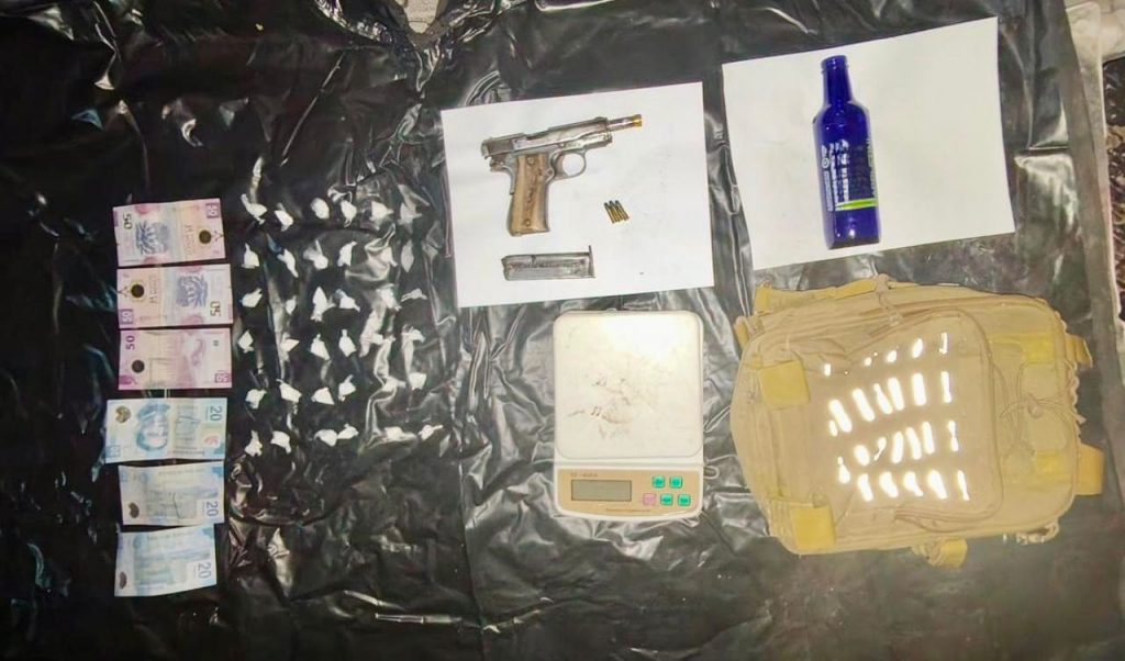 El masculino se identificó como Luis “N”, de 36 años de edad y se le solicitó realizar una revisión preventiva a sus pertenencias, en las que encontraron: un arma corta abastecida, 36 dosis de una sustancia sólida parecida al cristal; una báscula digital y dinero en efectivo.