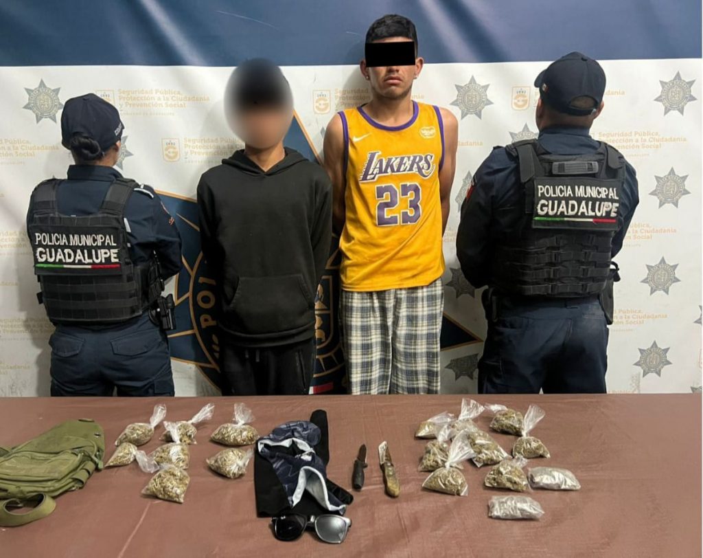 Dos hombres, uno de ellos menor de edad, fueron detenidos por policías de Guadalupe tras una persecución, al ser sorprendidos en posesión de diversas dosis de droga, armas blancas y equipo utilizado para ocultar su identidad.