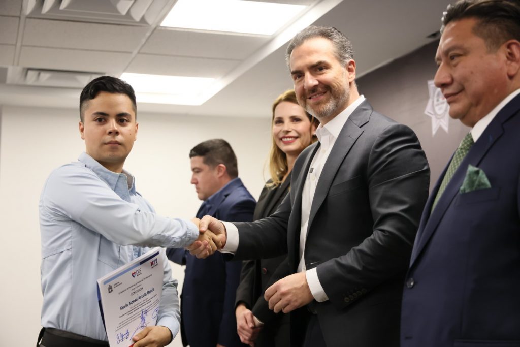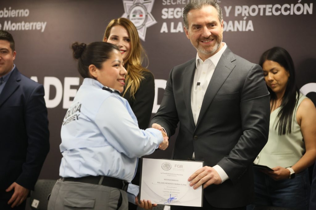 En la entrega de constancias estuvieron presentes Gonzalo González, delegado de la Fiscalía General de la República en Nuevo León; Eduardo Sánchez Quiroz, comisario general de la Secretaría de Seguridad y Protección a la Ciudadanía; Brisilot Sandoval, director de Desarrollo Institucional y Carrera Policial; y Xóchitl Loredo, directora general del DIF Monterrey.