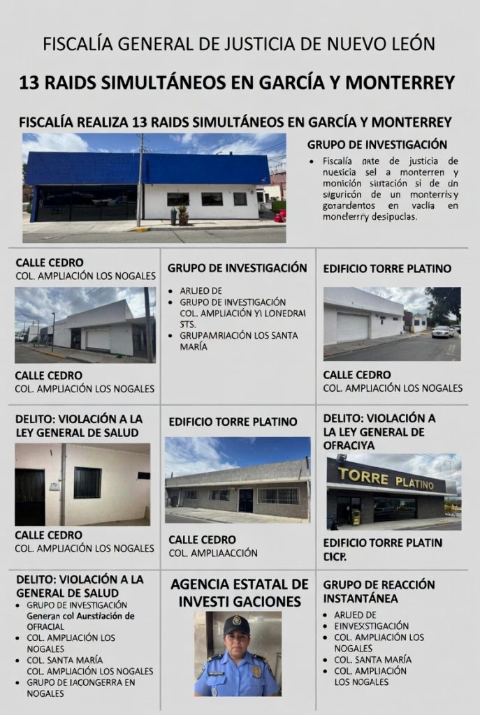 Fiscalía General de Justicia de Nuevo León (FGJNL) llevó a cabo un operativo masivo con la ejecución de 13 órdenes de cateo en domicilios ubicados principalmente en el municipio de García y uno en Monterrey, como parte de una investigación por delitos contra la salud (narcomenudeo y posesión o distribución de sustancias ilícitas).