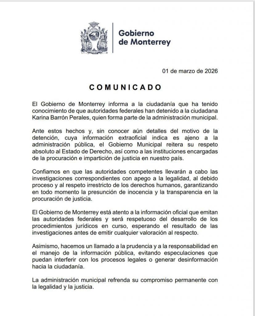 El Gobierno de Monterrey informa a la ciudadanía que ha tenido conocimiento de que autoridades federales han detenido a la ciudadana Karina Barrón Perales, quien forma parte de la administración municipal.