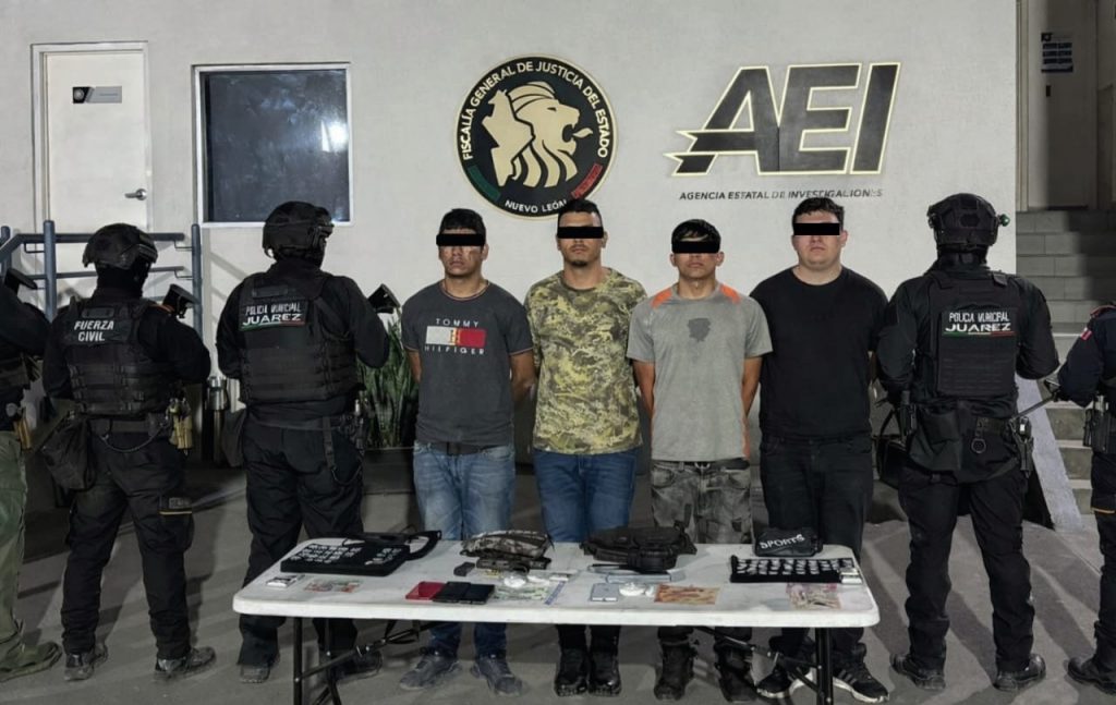 JUÁREZ, N.L.– Cuatro generadores de violencia fueron detenidos y puestos a disposición del Ministerio Público por portación de arma de fuego y delitos contra la salud, tras una intervención realizada por el Grupo de Control de la Violencia en la colonia Lagos de Zirándaro.
