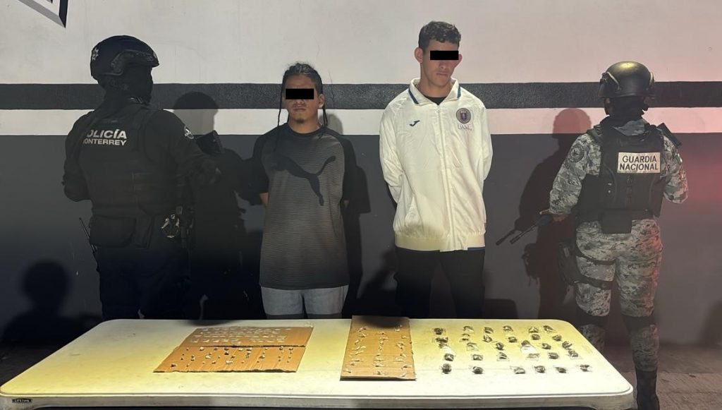 Oficiales de la Policía de Monterrey en conjunto con la Guarda Nacional, lograron capturar a dos masculinos originarios de Honduras, luego que presuntamente tenían en su poder 124 dosis de diversas sustancias y hierba similares a la droga tipo cristal, cocaína en polvo y mariguana.