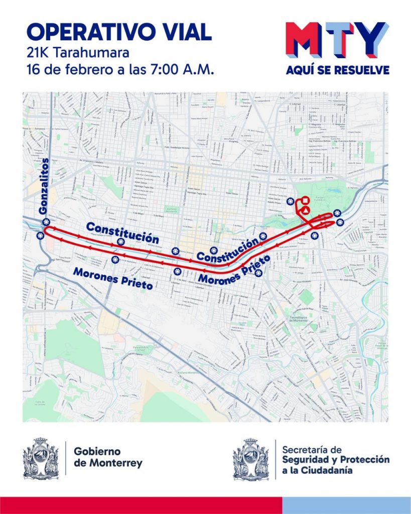 La Dirección de Vialidad y Tránsito de Monterrey informa que este domingo 16 de febrero se llevará a cabo un operativo vial con motivo de la carrera “21K Tarahumara 2025”, la cual tendrá lugar frente al Parque Fundidora.