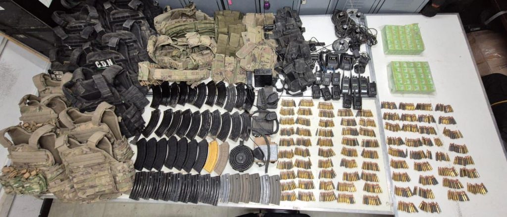 Al inspeccionar el área, encontraron los siguientes indicios ilícitos: 18 cargadores desabastecidos, 27 cargadores con 30 balas cada uno, un cargador de tambor; 12 radios portátiles, cinco antenas, tres radiocomunicadores, cuatro bases para radio; un módem, 50 cajas con 20 balas, 15 chalecos balísticos, seis pierneras portacargador, seis portacargadores y cinco fornituras.