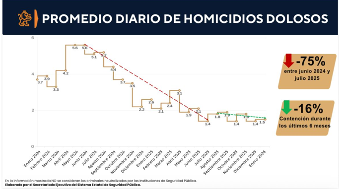 En cuanto al promedio diario de los cuatro tipos principales de robos (casa habitación, negocio, persona y vehículo), el indicador registra 29 reportes por día, frente a los 37 registrados en 2025 y los 44 del año 2024, lo que indica que este delito también se encuentra en fase de contención.