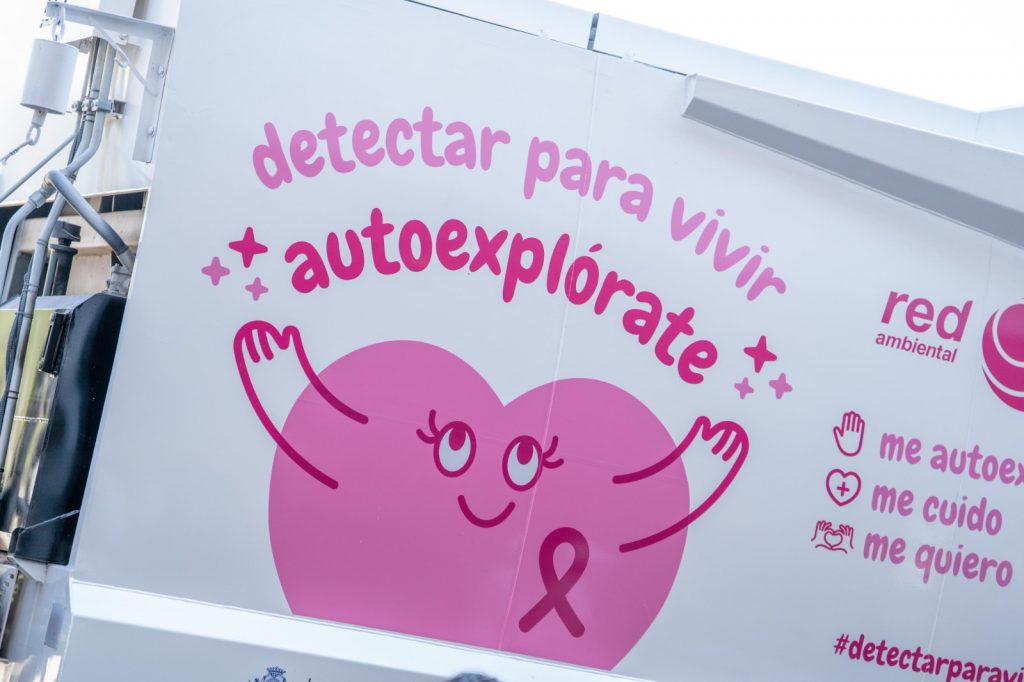 Con los camiones de la basura pintados de rosa, se envía el mensaje: “detectar para vivir, autoexplórate” a fin de concientizar a la comunidad sobre la importancia de prevenir el cáncer.