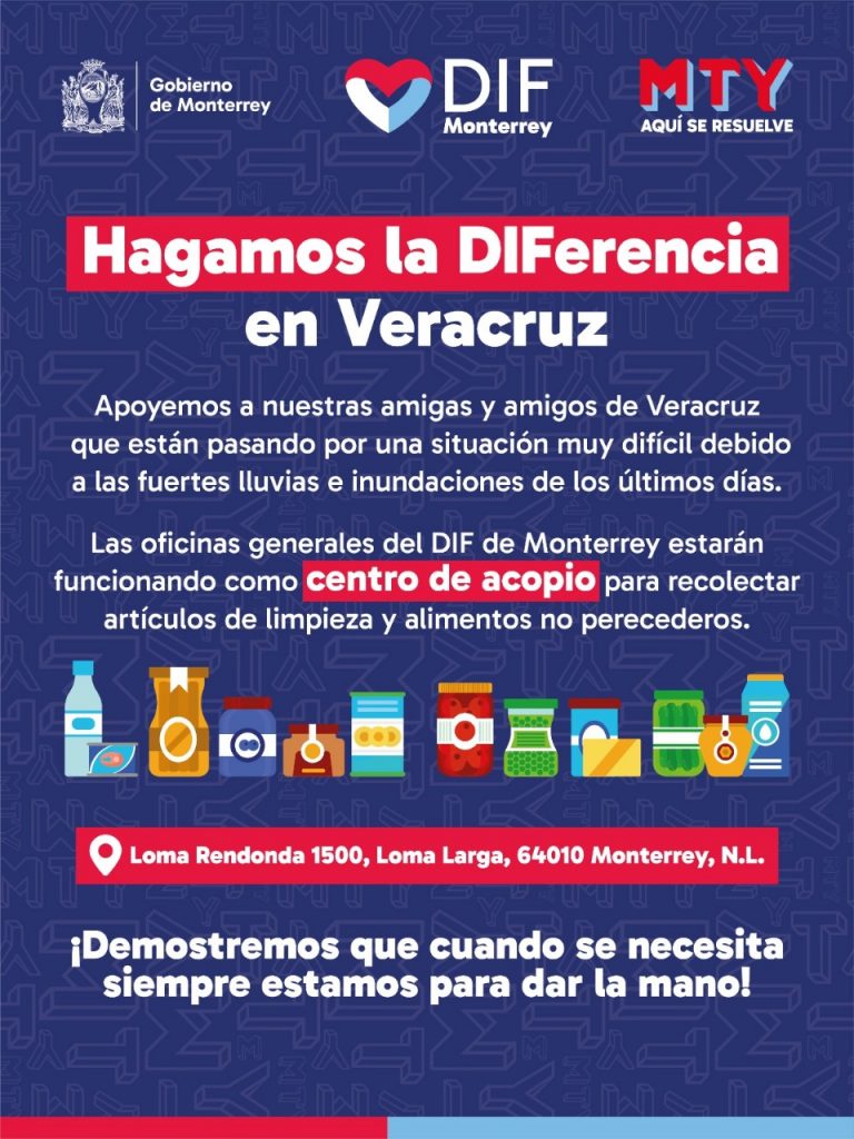 El Gobierno de Monterrey, a través del DIF que preside Gaby Oyervides, instaló un centro de acopio para apoyar a las familias de Veracruz que resultaron afectadas por las fuertes lluvias e inundaciones registradas en los últimos días.